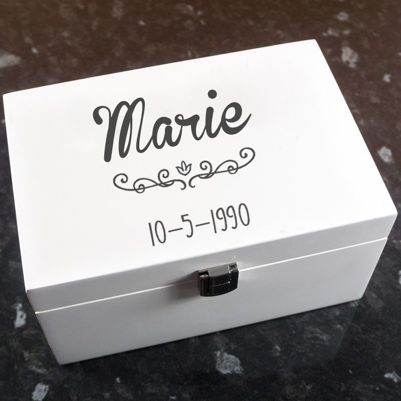 • Une belle boîte à bijoux en bois laqué blanc avec le texte que vous souhaitez graver est le cadeau Myoriginalgift que vous recherchez.