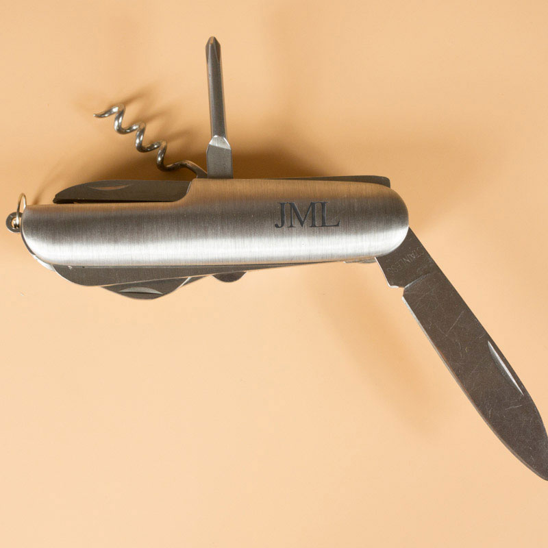 Un couteau de poche aux 9 usages différents et en acier inoxydable, un couteau de poche personnalisé avec initiales gravées.